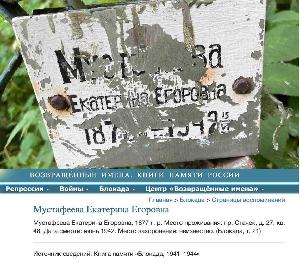 Екатерина Егоровна Мустафеева. Место захоронения в книге памяти неизвестно. Но мы теперь знаем, что это Громовское кладбище.