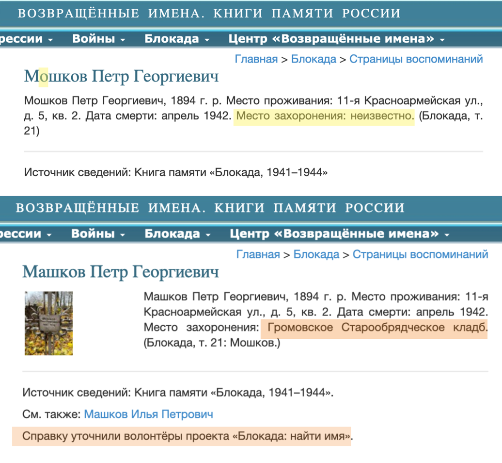 Например, в книгах написано, что человек похоронен на Пискаревском, а мы находим его памятник на Громовском. Отличаться может и дата рождения, и дата смерти.