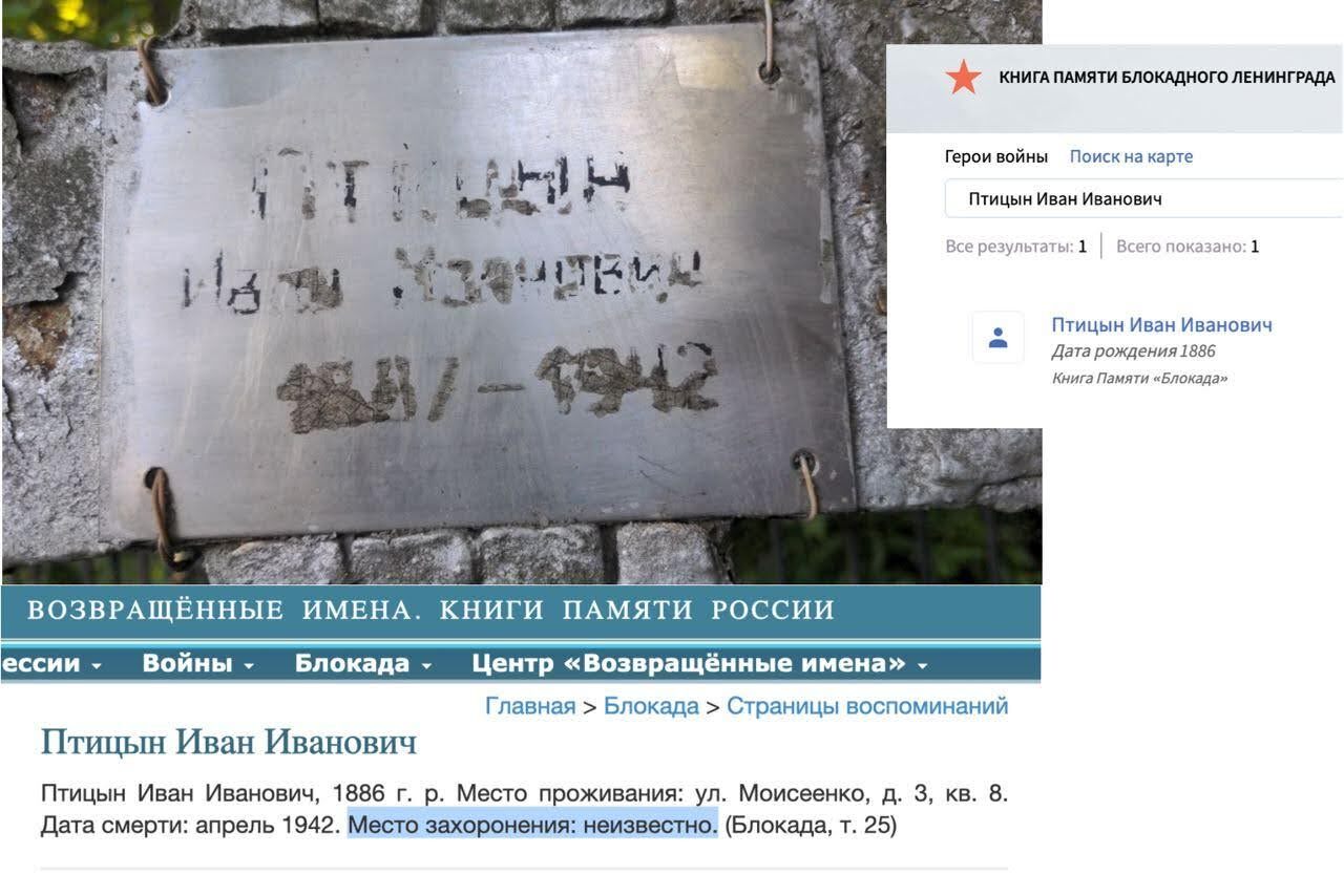Например, Птицын Иван Иванович. Один единственный во всех книгах памяти. И там сказано, что место захоронения неизвестно. Мы нашли памятник на Волковском Православном.