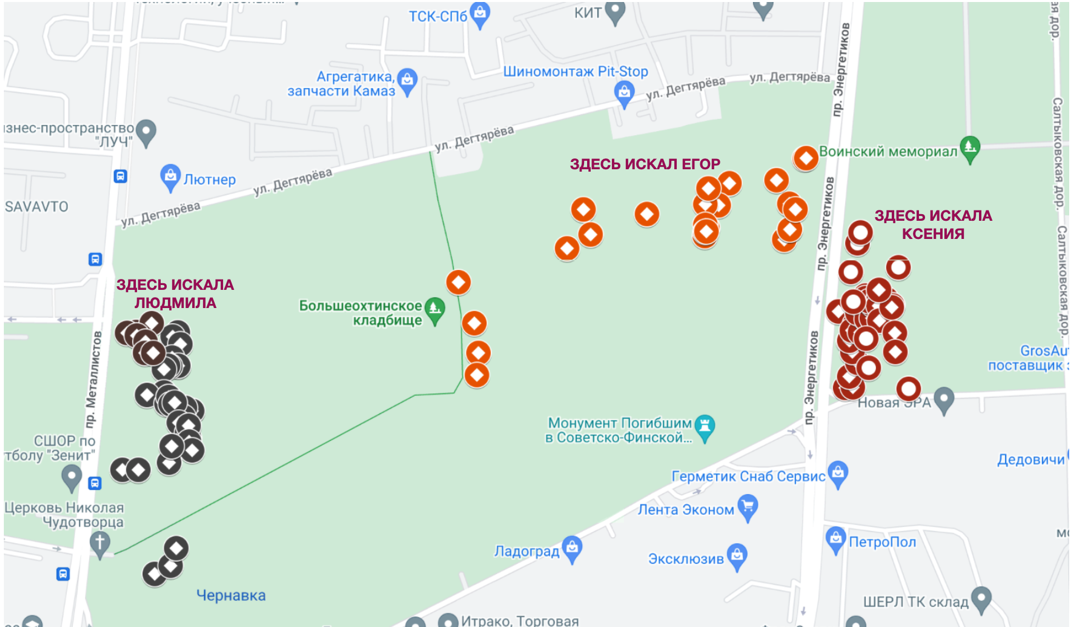 Во время поиска имен каждый волонтер снимает не только фото, но и координаты найденных памятников – после я наношу их на карту. Это визуально закрепляет пройденные участки и помогает распределять дальнейшую работу.