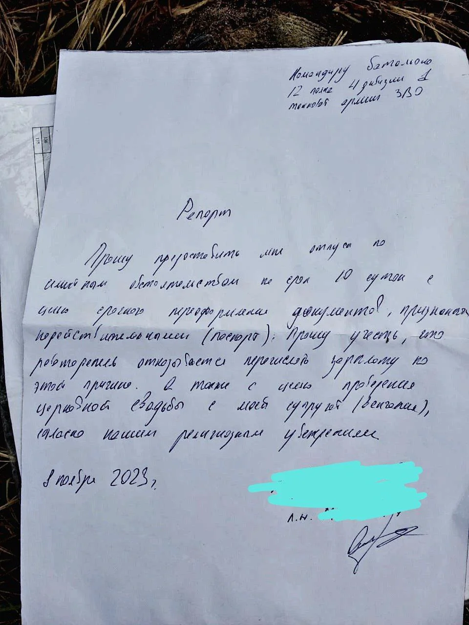 8 ноября Андреев написал рапорт, попросив предоставить отпуск на 10 суток для срочной замены устаревшего паспорта. «Прошу учесть, что работодатель по этой причине отказывается перечислить зарплату. А также [отпуск нужен] с целью проведения церковной свадьбы с моей супругой, согласно нашим религиозным убеждениям», — говорится в рапорте, который Андреев написал на имя командира батальона (есть в распоряжении «Новой-Европа»).