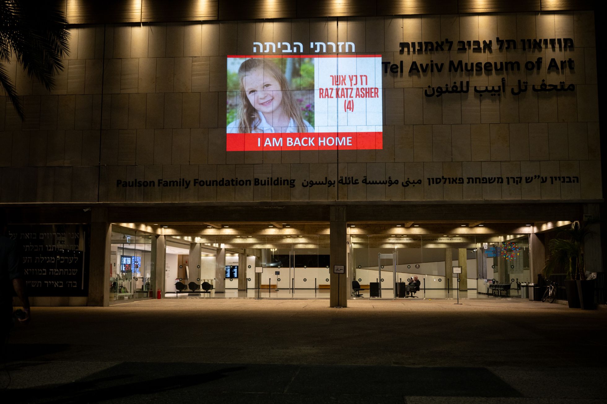 Alexi J. Rosenfeld / Getty Images Фотография пятилетней заложницы проецируется на Музей современного искусства в Тель-Авиве после ее освобождения. 24 ноября 2023 года