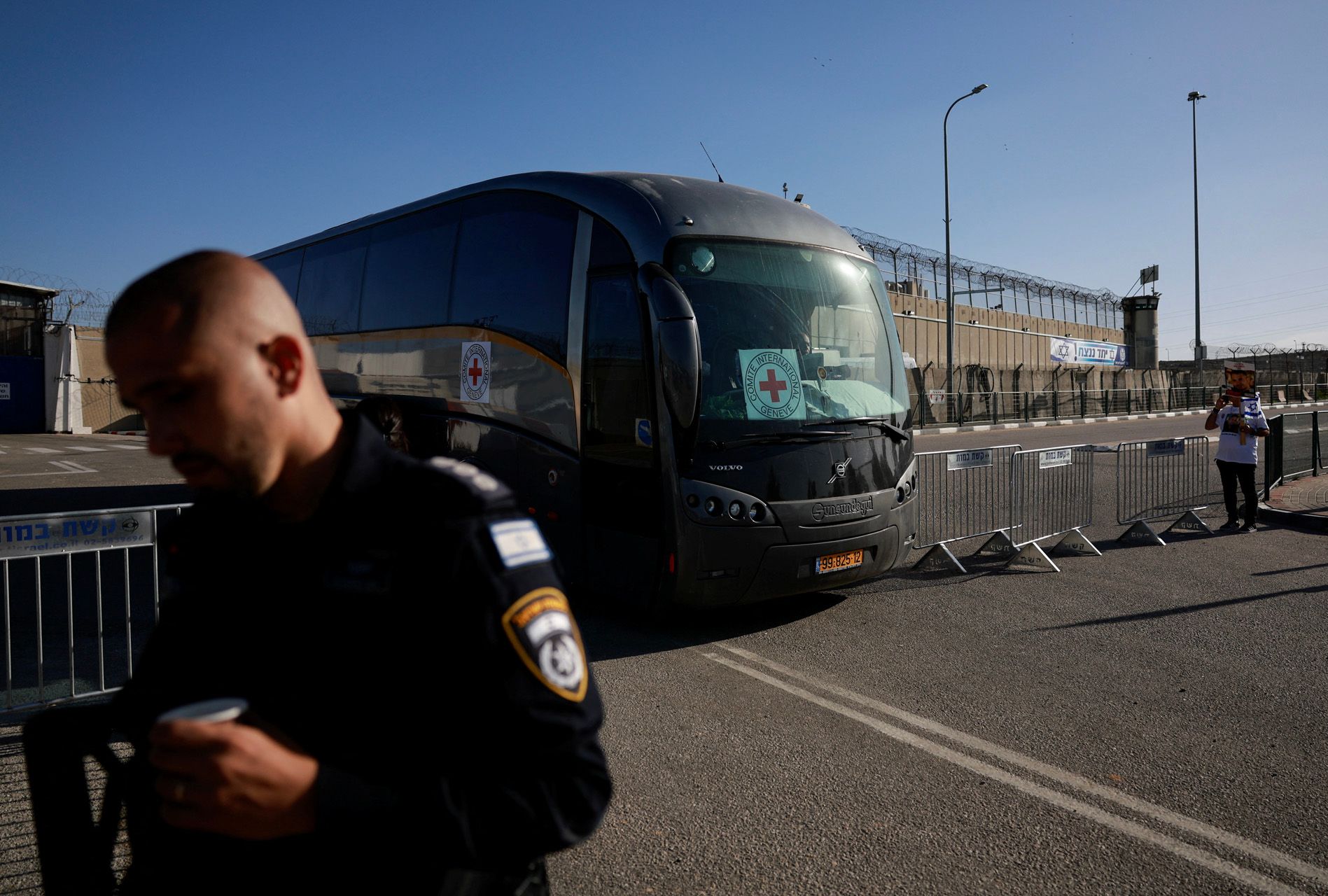 Ammar Awad / Reuters / Scanpix / LETA Автобус Красного Креста возле военной тюрьмы Офер на Западном берегу Иордана — на нем привезли палестинских заключенных, которые будут освобождены в рамках соглашения Израиля и ХАМАС. 24 ноября 2023 года