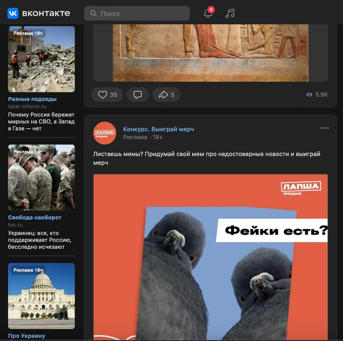 Мы наблюдали за ней месяц, не будучи активными пользователями «ВКонтакте». И нашли не менее 50 баннеров с рекламой Путина и СВО. Для их созерцания не требуется быть подписанным на какие-либо паблики, конструкции встроены в ленту пользователя помимо его желания.