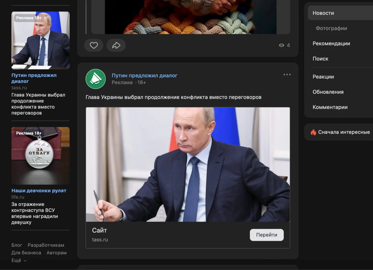 Как только пользователь входит в аккаунт и открывает ленту новостей, баннеры и изображения Путина со ссылками на различные сайты могут занимать буквально весь «первый экран» — блок, который видно сразу, как только открываешь сайт. Заголовки вроде