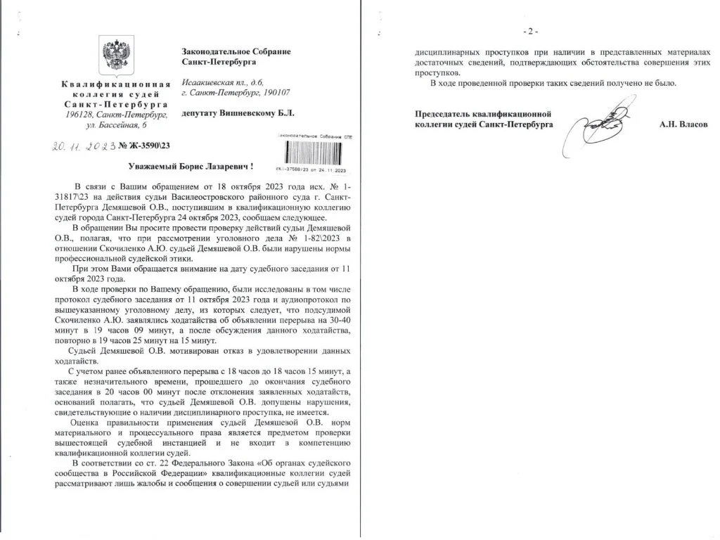 «В соответствии со ст.22 Федерального Закона "Об органах судейского сообщества в Российской Федерации" квалификационные коллегии судей рассматривают лишь жалобы и сообщения о совершении судей или судьями дисциплинарных проступков при наличии в представленных материалах достаточных сведений, подтверждающих обстоятельства совершения этих проступков. В ходе проверки таких сведений получено не было», — сообщается в ответе за подписью председателя квалификационной коллегии судей Санкт-Петербурга Андрея Власова.