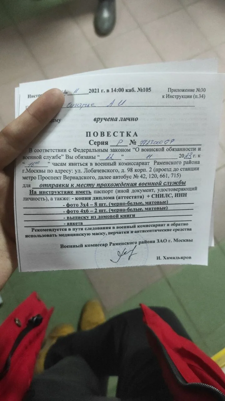 Его отвезли в Даниловский военкомат, чтобы составить протокол об административном правонарушении по определению о приводе от военного комиссара. Вместо этого его заставили пройти медицинское освидетельствование, а затем — поехать на сборный пункт.