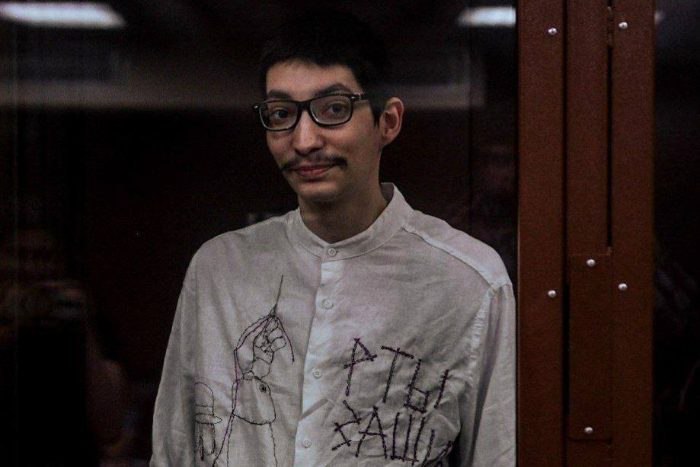Что за рубашка. На рубашке, которую Крисевич надевал на первое судебное заседание, вышита надпись «Рты зашиты» и скелет ФСИН-инспектора, который вытянул руку с иглой к воротнику.
