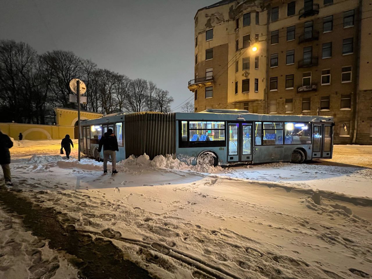 Так, на проспекте Мечникова в снегу увяз автобус, пишут очевидцы. То же самое произошло с автобусом-гармошкой на углу Тверской и Таврической. А на проспекте Энгельса трамваи встали из-за аварии.