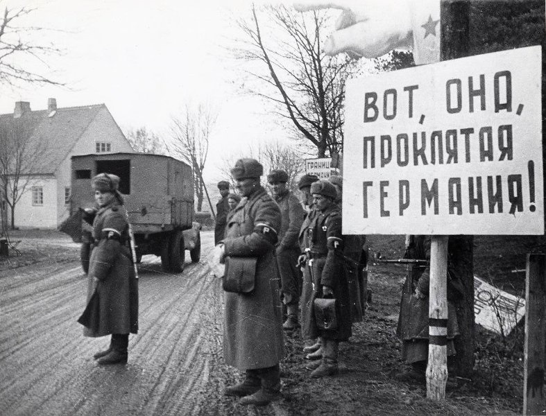 Знаменитая фотография Виктора Тёмина, где изображён плакат "Вот она, проклятая Германия!", к которому для наглядности приделано изображение руки, указывающей в нужном направлении, сделана в конце 1944 года именно в Восточной Пруссии. То есть речь шла о централизованной политике, тем более если вспомнить, что в эти месяцы Илья Эренбург в армейской газете "Красная звезда" публиковал статьи, полные ненависти по отношению не только к солдатам вермахта, но и к немцам как народу и был одёрнут в "Правде" лишь 14 апреля 1945 года.