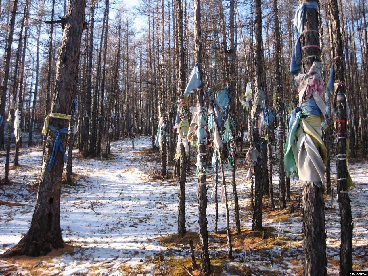 У подножия Белой горы в Багдарине находится бурхан. Это место молитв. Деревья здесь принято обвязывать цветными лентами, загадывая желания.