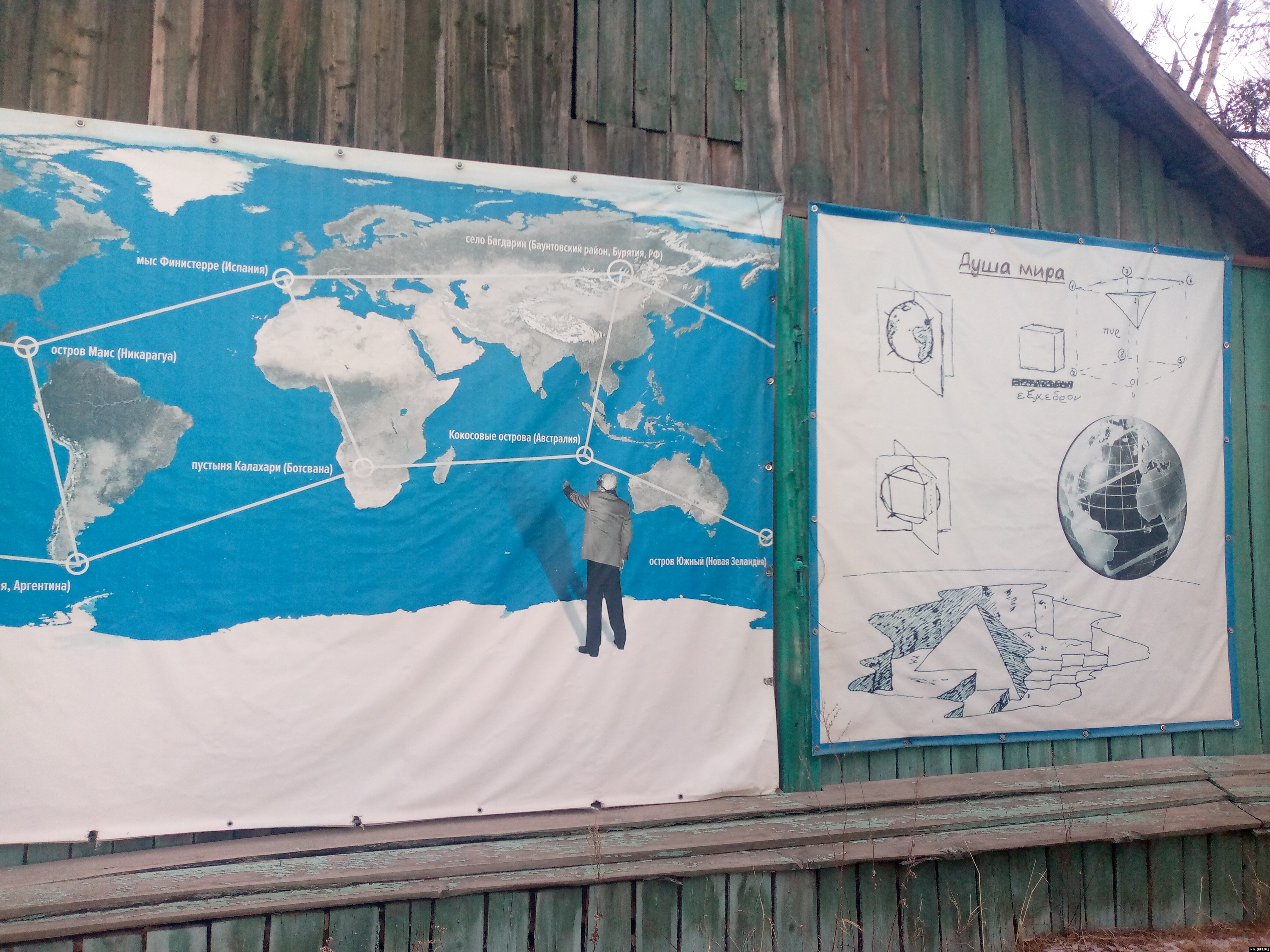 На задней стене бывшего военкомата – огромные стенды с надписью "Душа мира". Появились они в 2014 году, после приезда в Багдарин путешественника из Испании Рафаэля Тренора.