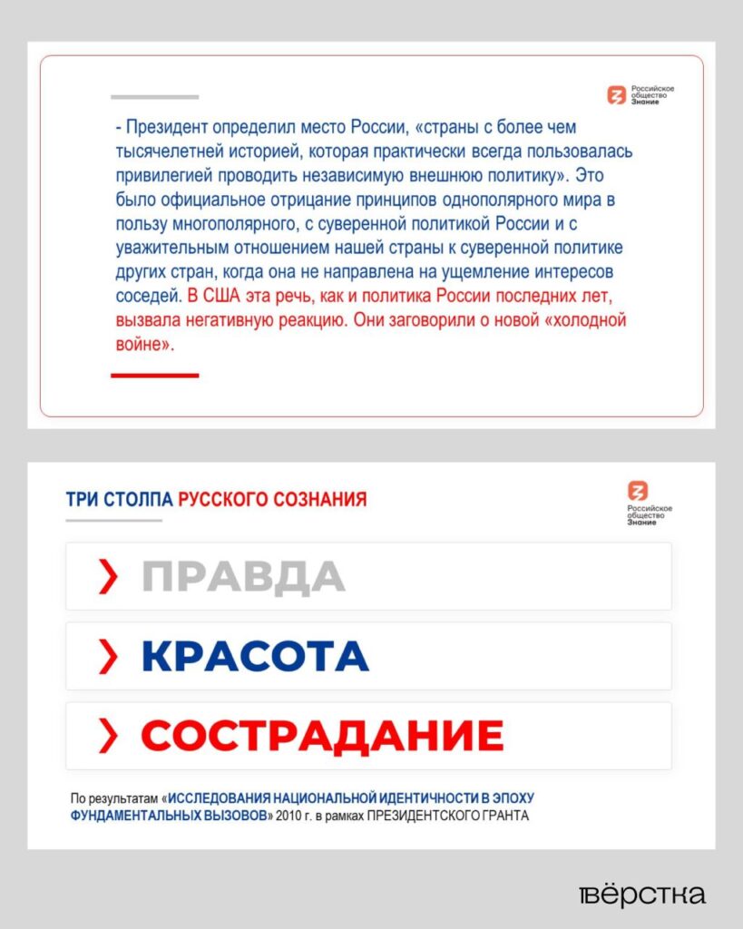 Согласно презентации, «большинство народа» поддерживает Путина в «отстаивании суверенитета», которым он занимается «с самого начала» своего правления. В качестве примера «отстаивания» Вайц приводит антизападную «Мюнхенскую речь» Путина в 2007 году, войну в Грузии 2008 года, аннексию Крыма («защита волеизъявления жителей» полуострова), а также нынешнюю войну в Украине.