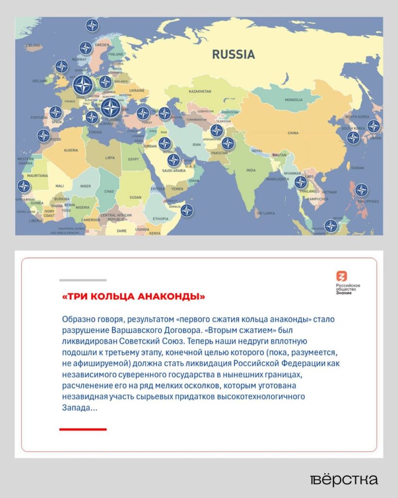 Как говорится в презентации, главный враг на пути к полному суверенитету России — это НАТО и США. Вайц демонстрирует карты, из которых следует, что РФ буквально находится в кольце военных баз Североатлантического альянса. При этом вокруг России — сплошные очаги напряженности. Например, ситуацию в Грузии, «потепление в отношениях» с которой «вызывает неприкрытую тревогу на Западе», Вайц называет «танцем на углях», а в соседней Армении и вовсе находится «огненный пояс». Не забывает лектор и о Китае, от которого России не стоит ждать ничего хорошего в «горниле», то есть в Центральной Азии.