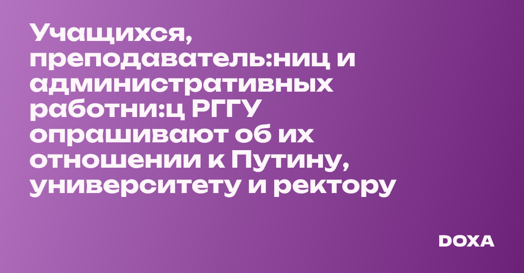 В РГГУ студено:к, преподаватель:ниц и административных работни:ц РГГУ опрашивают об их отношении к Владимиру Путину, России и своему университету и его ректору. Онлайн-опрос позиционируется как анонимный, однако для его прохождения необходимо зарегистрироваться через VK или по номеру телефона. Согласно приказу, который есть в распоряжении DOXA, опрос должны пройти первокурсни:цы, преподаватель:ницы и административные работни:цы в соответствии с квотами по факультетам и подразделениям.