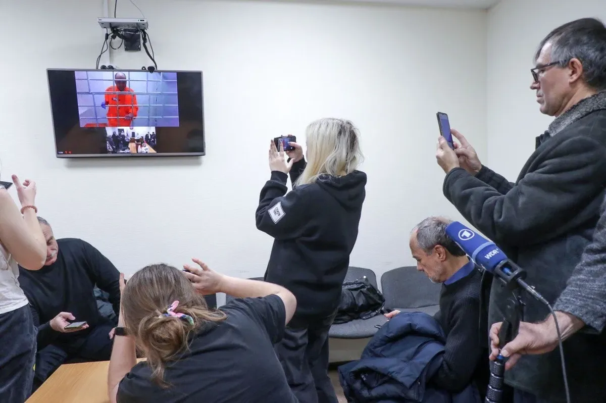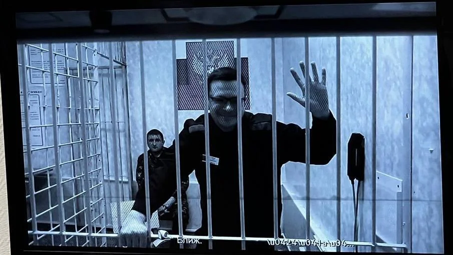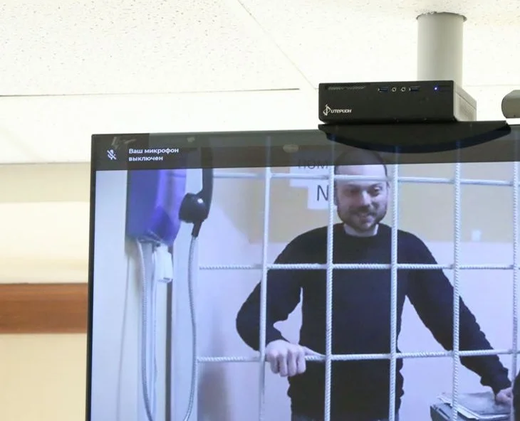 В небольшом зале Замоскворецкого суда — видеоконференция из омского ИК-6. На экране большая клетка. Мы видим человека в оранжевой робе, в таких обычно в американских фильмах показывают заключенных. Изображение на экране постоянно мигает — то синим, а то красным. Когда включают микрофон, Владимир Кара-Мурза начинает говорить с присутствующими в зале друзьями и журналистами. Пока заседание еще не началось, он разговаривал с пришедшим его поддержать советским диссидентом Александром Подрабинеком.