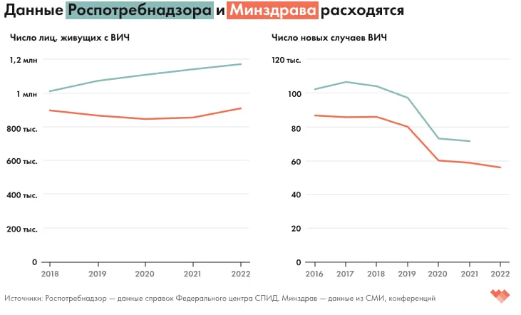 Авторы исследования отмечают, что точное количество инфицированных граждан неизвестно. Так, в 2022 году Роспотребнадзор сообщил о 1,2 миллиона россиян с ВИЧ (прирост на 71 тысячу человек). В свою очередь главный внештатный специалист по ВИЧ Минздрава заявлял о 909 тысячах человек, а спустя полгода — о 887 тысячах.
