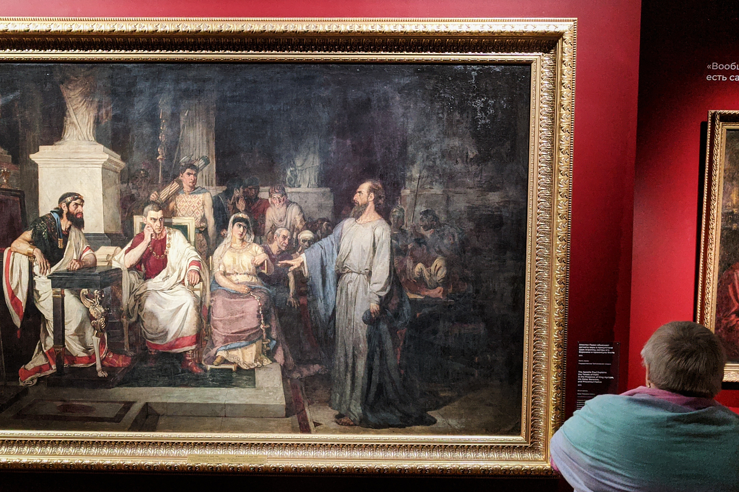 Этот сопроводительный материал занимает одну из стен целиком, а с другой стороны представлены работы художника разных лет: от раннего «Княжьего суда», написанного во время учебы в Академии художеств до большого исторического полотна «Степан Разин», написанного в 1906 году и частично переписанного четыре года спустя.