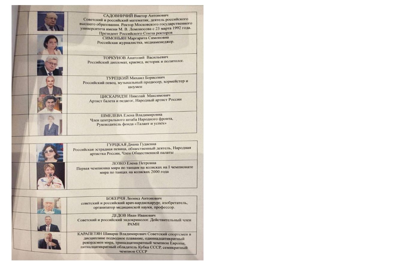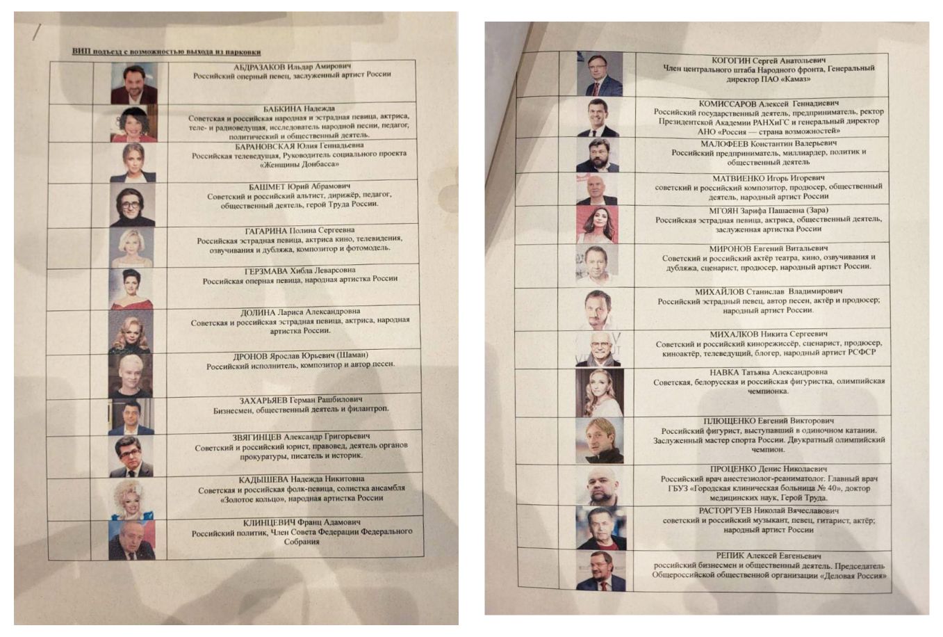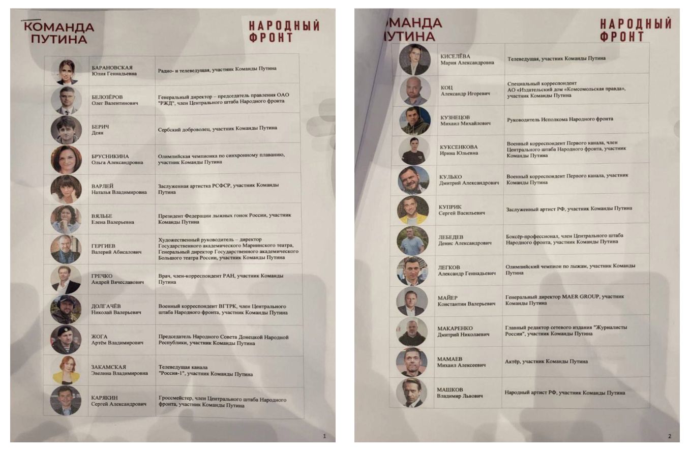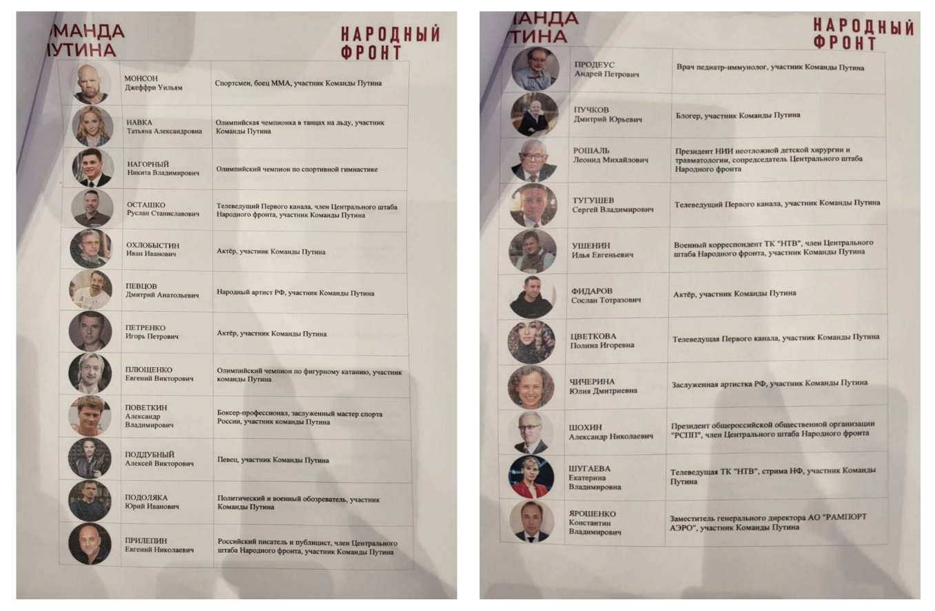В инициативную группу по выдвижению вошли секретарь генсовета «Единой России» Андрей Турчак, спикер парламента аннексированной ДНР Артем Жога, бывшие спортсмены Татьяна Навка и Джеффри Монсон, актеры Дмитрий Певцов и Владимир Машков, певец Ярослав Дронов (Шаман), шахматист Сергей Карякин, дирижер Валерий Гергиев, летчик Константин Ярошенко и еще несколько десятков человек.