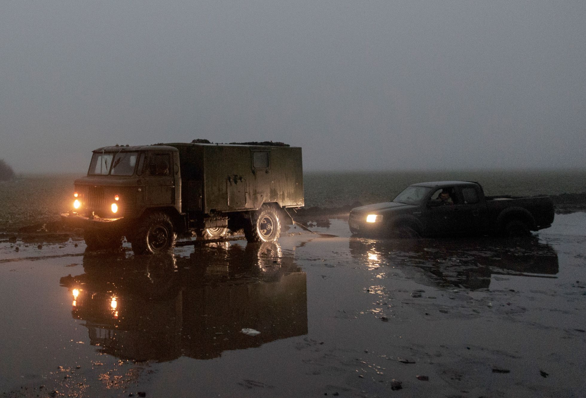 Украинские военные буксируют внедорожник, застрявший на линии фронта в Запорожской области. 18 декабря 2023 года