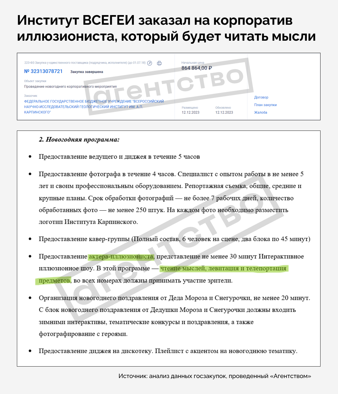 Всероссийского научно-исследовательского геологического института, который в этом году решил отказаться от аббревиатуры ВСЕГЕИ, заказал на новогодний корпоратив актера-иллюзиониста, который должен устроить шоу с чтением мыслей, левитацией и телепортацией предметов. За всю развлекательную программу учреждение заплатит около 900 тысяч рублей, свидетельствуют данные сайта госзакупок.
