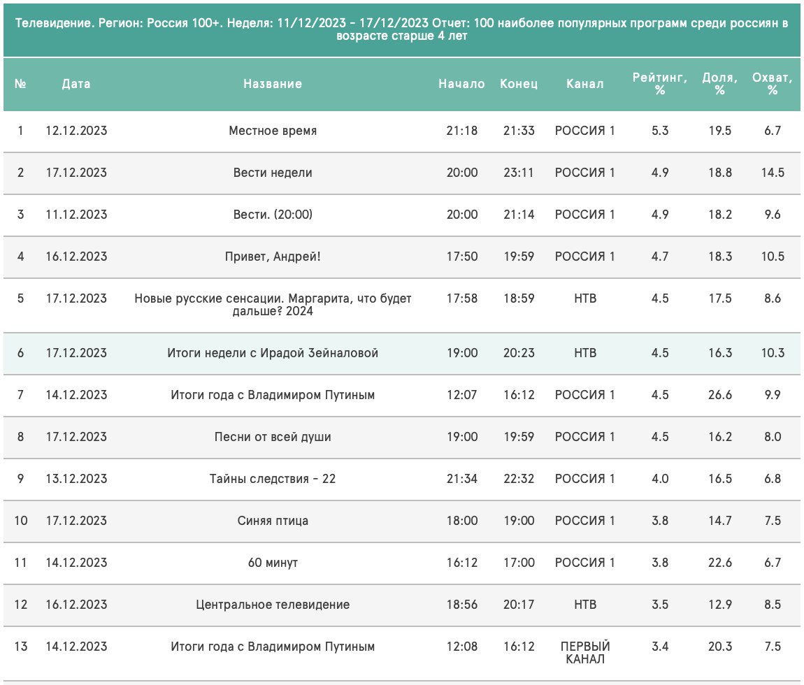 - Трансляция «Итогов года» на «Первом канале» оказалась на 13-м месте, на НТВ — на 68-м.