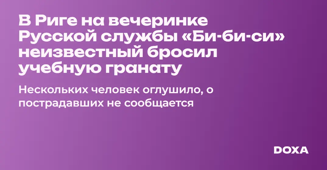 На вечеринке сотрудни:ц Русской службы «Би-би-си» в рижском баре Čē неизвестный бросил учебную гранату, сообщила «Новая газета Европа» со ссылкой на очевидца. Полиция Латвии возбудила уголовное дело о хулиганстве. По предварительной информации, пострадавших нет.