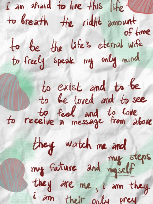 Я чувствую, что для нее поэзия — это акт надежды, которая разрезает тьму войны. Ее боль не уходит, но в вместе с самой девушкой растет ее талант, а сердце вбирает много больше, чем может предложить война и насилие (если они вообще что-то могут предложить). Ее средства борьбы — это наушники и слова на бумаге, которые складываются в стихиНиже, с согласия девушки, мы публикуем одно из ее стихотворений.. Мое средство борьбы — рассказывать нашим читатель:ницам об их словах и историях.