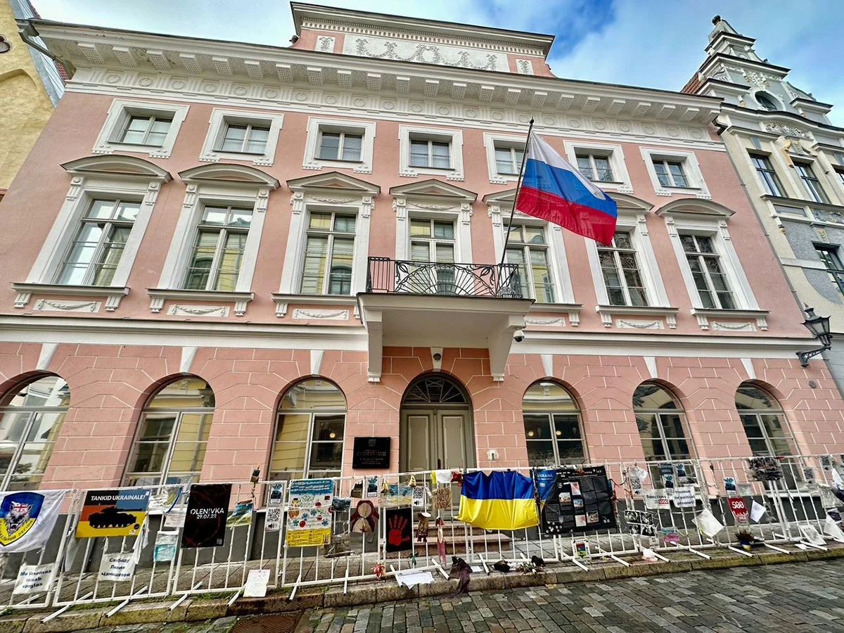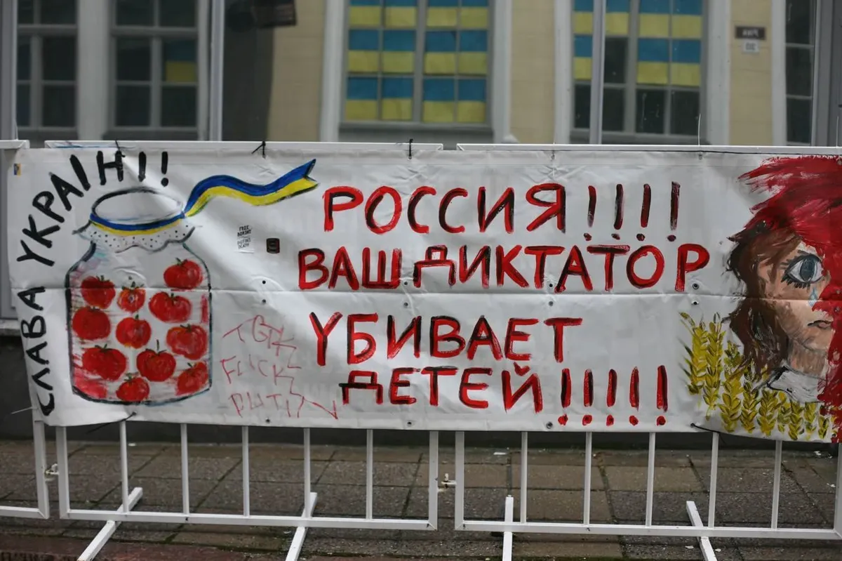 Вид на посольство России в Таллинне. Фото: Daniel ThülerПлакат «Россия! Ваш диктатор убивает детей» напротив входа в посольство. Фото от подписчиков «Новой-Европа»