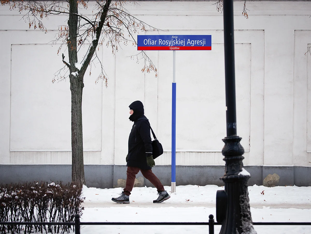 Табличка с названием улицы «Жертвы российской агрессии», на которой расположено российское посольство, в Варшаве, Польша, 14 декабря 2022 года. Улица была переименована после вторжения России на Украину. Фото: STR / NurPhoto / Getty Images