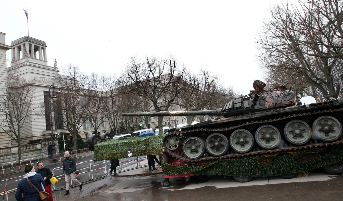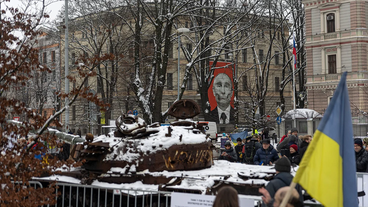 Сгоревший российский танк, привезенный из Украины на фоне иллюстрации с изображением Владимира Путина у российского посольства в Риге, 24 февраля 2023 года. Фото: Владислав Докшин / «Новая-Европа»