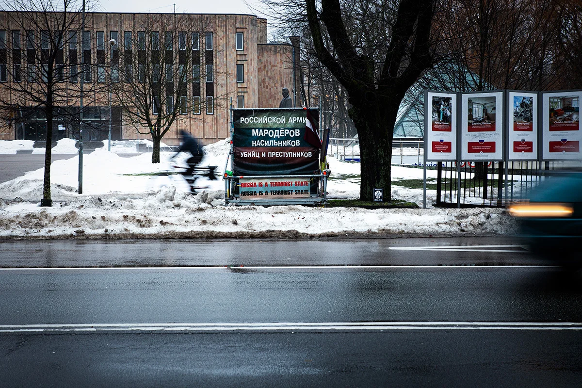 Инсталляция с Путиным и виселицей рядом с посольством, 24 февраля 2023 года. Фото: Владислав Докшин / «Новая-Европа»Плакат «Российской армии мародеров, насильников, убийц и преступников» напротив здания посольства, 18 декабря 2023 года. Фото: Владислав Докшин / «Новая-Европа»