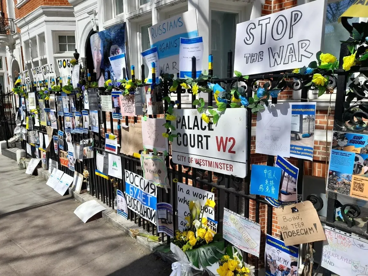 Забор в цветах украинского флага у посольства. Фото: Петр ПетренкоЛистовки «россияне против войны» напротив посольства. Фото: Петр Петренко