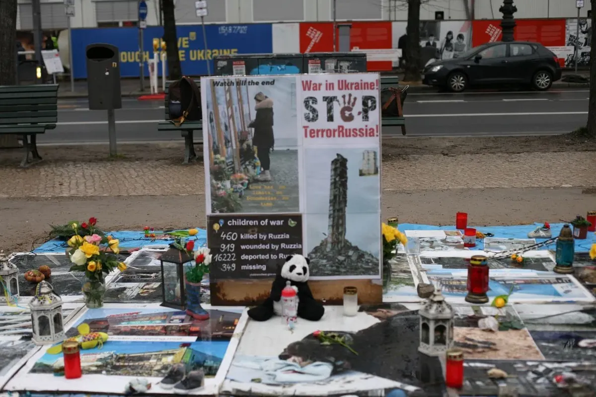 Сгоревший в Украине российский танк напротив здания посольства, 24 февраля 2023 года. Фото: Wolfgang Kumm / picture alliance / Getty ImagesИнсталляция «Стоп войне» напротив посольства. Фото от подписчиков «Новой-Европа»
