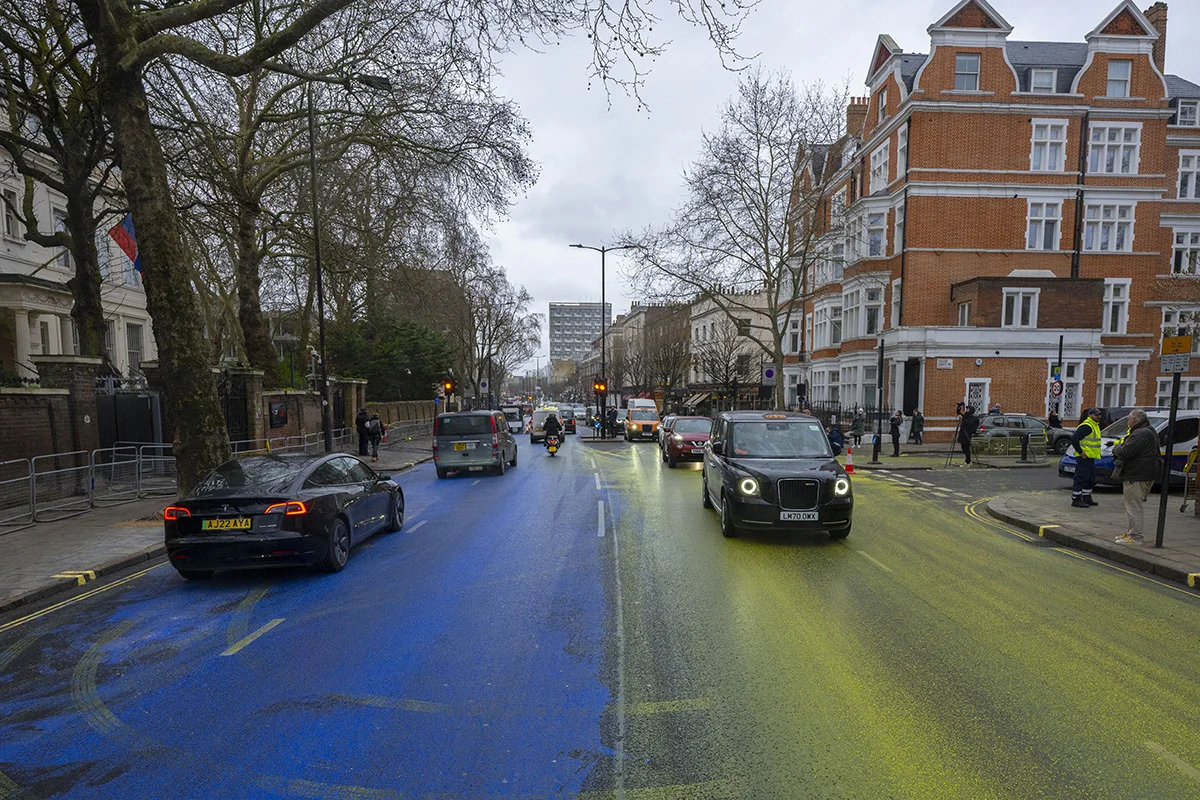 Группа активистов покрыла краской улицу перед посольством РФ, чтобы создать на ней украинский флаг, Лондон, 23 февраля 2023 года. Фото: Rasid Necati Aslim / Anadolu Agency / Getty ImagesАнтивоенные листовки рядом с посольством. Фото от подписчиков «Новой-Европа»