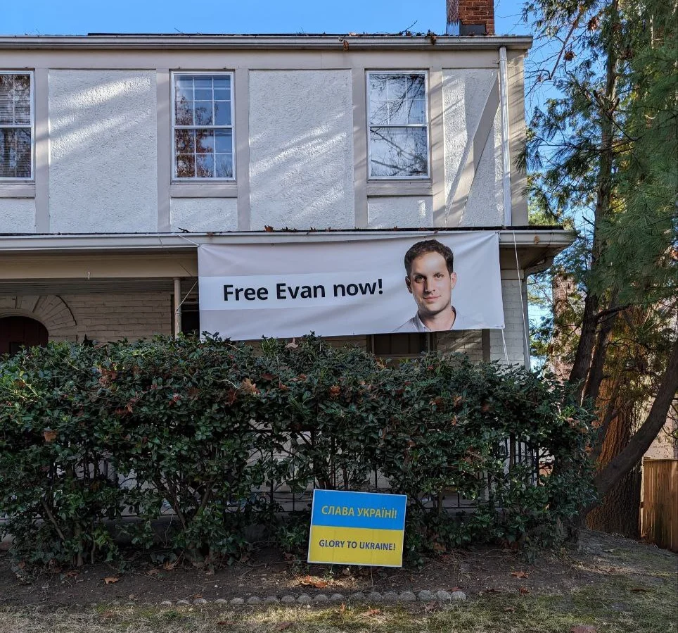 Забор в цветах украинского флага у посольства. Фото от подписчиков «Новой-Европа»Плакат «Свобода Эвану» и флаг Украины у посольства. Фото от подписчиков «Новой-Европа»