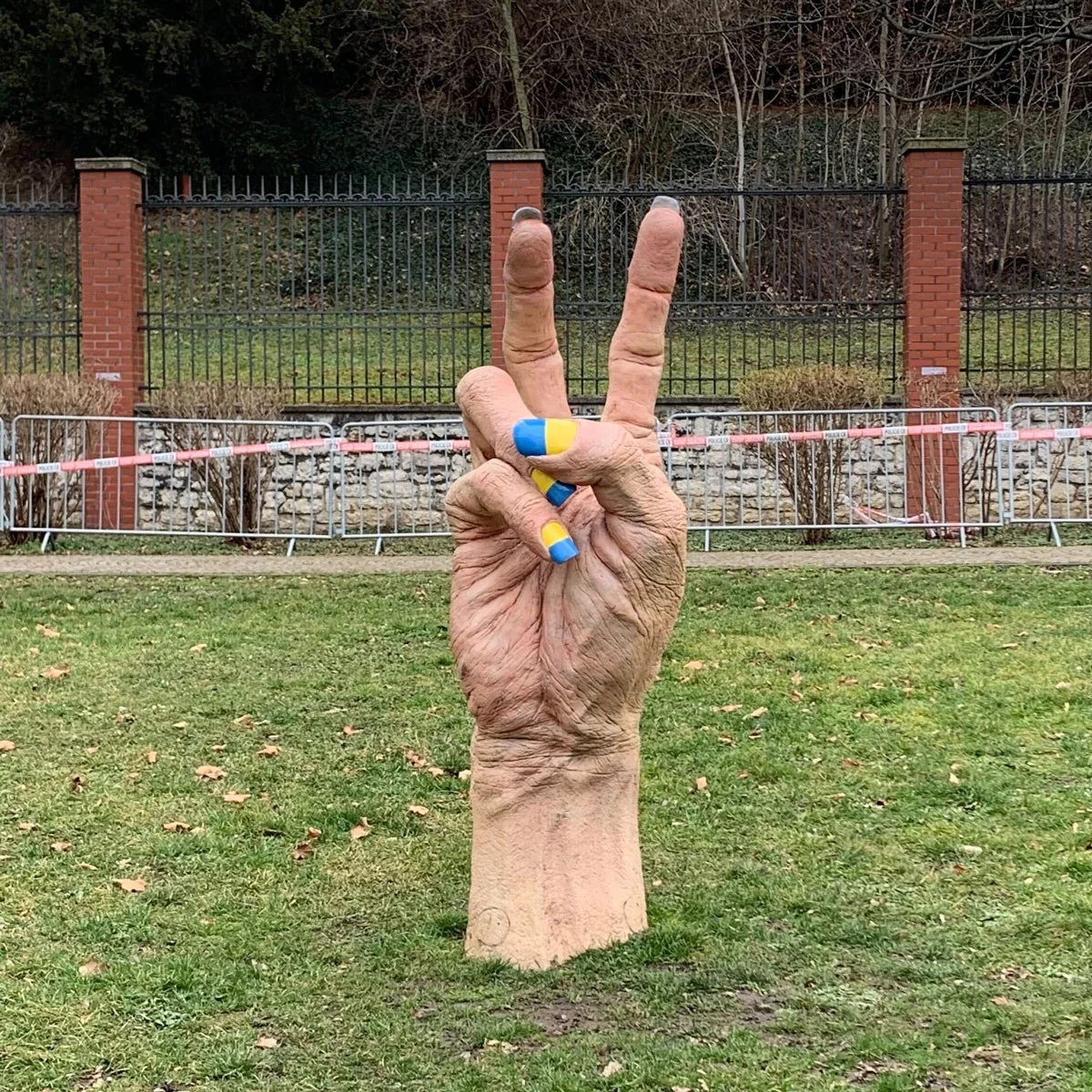 Инсталляция руки с маникюром в цветах украинского флага рядом с посольством. Фото: Юлия Ахмедова