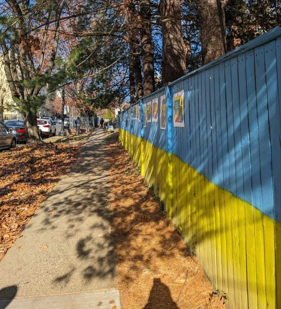 A fence outside the Russian embassy in Washington D.C. is painted in the colours of the Ukrainian flag. Photo sent by Novaya Europe subscribers“Free Evan” poster, asking for release of WSJ journalist Evan Gershkovich, and the Ukrainian flag at the Russian embassy in Washington D.C. Photo sent by Novaya Europe subscribers