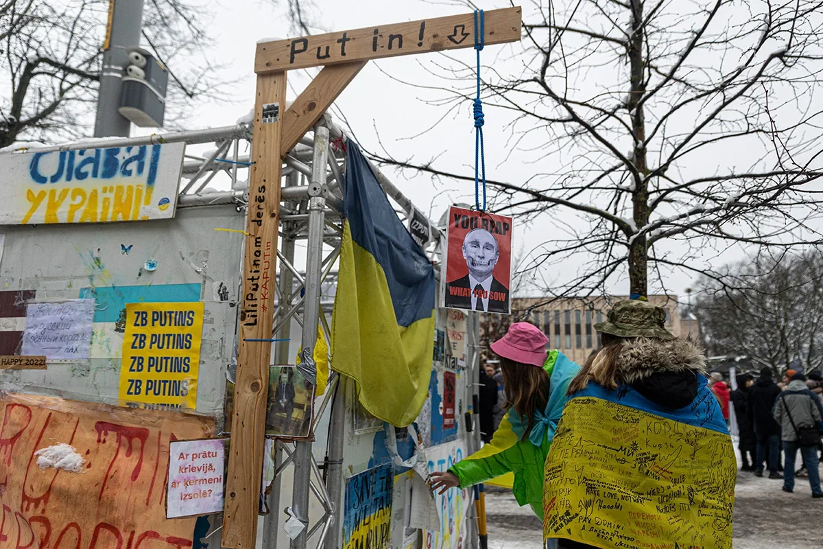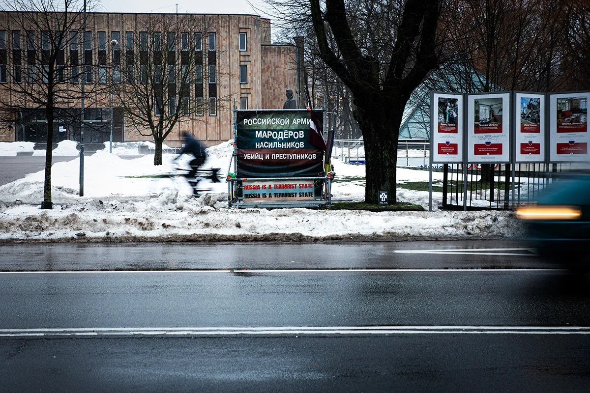 An art installation near the Russian embassy in Riga, Latvia, 24 February 2023. Photo: Vladislav Dokshin / Novaya EuropeA poster opposite the Russian embassy in Riga, Latvia, reads “The Russian army [is made up ] of marauders, rapists, murderers and criminals”, 18 December 2023. Photo: Vladislav Dokshin / Novaya Europe