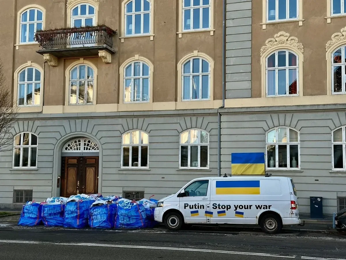 A van displaying the message “Putin, stop your war” parked in front of the Russian embassy in Copenhagen, Denmark. Photo: Daniel Thüler