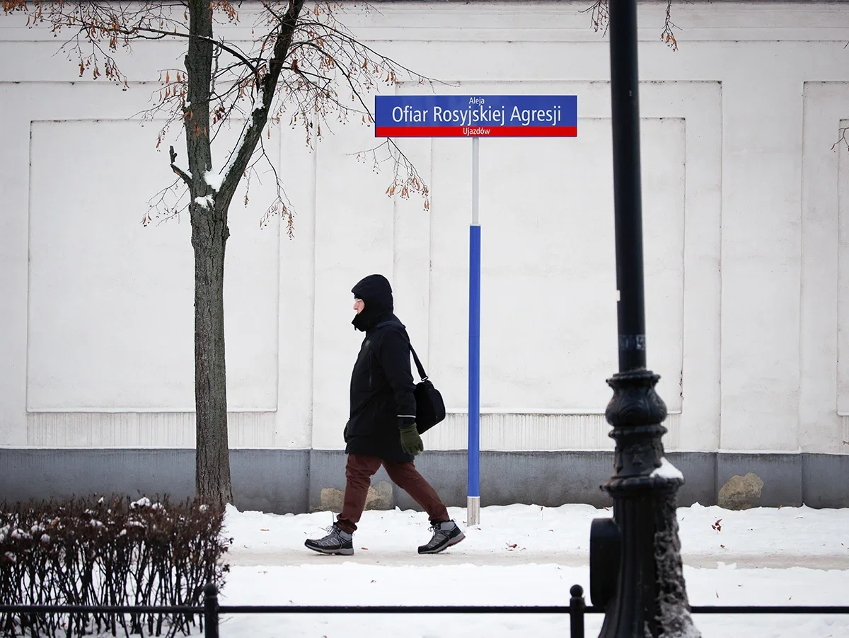 A street sign for the renamed “Victims of Russian Aggression Street” where the Russian embassy in Warsaw, Poland can be found. Photo: STR / NurPhoto / Getty Images