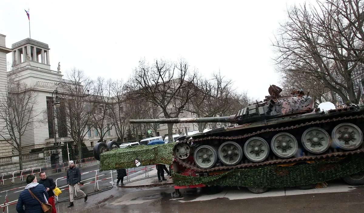 A burnt-out Russian tank from Ukraine against a backdrop of Putin near the Russian embassy in Riga, Latvia, 24 February 2023. Photo: Vladislav Dokshin / Novaya Europe
