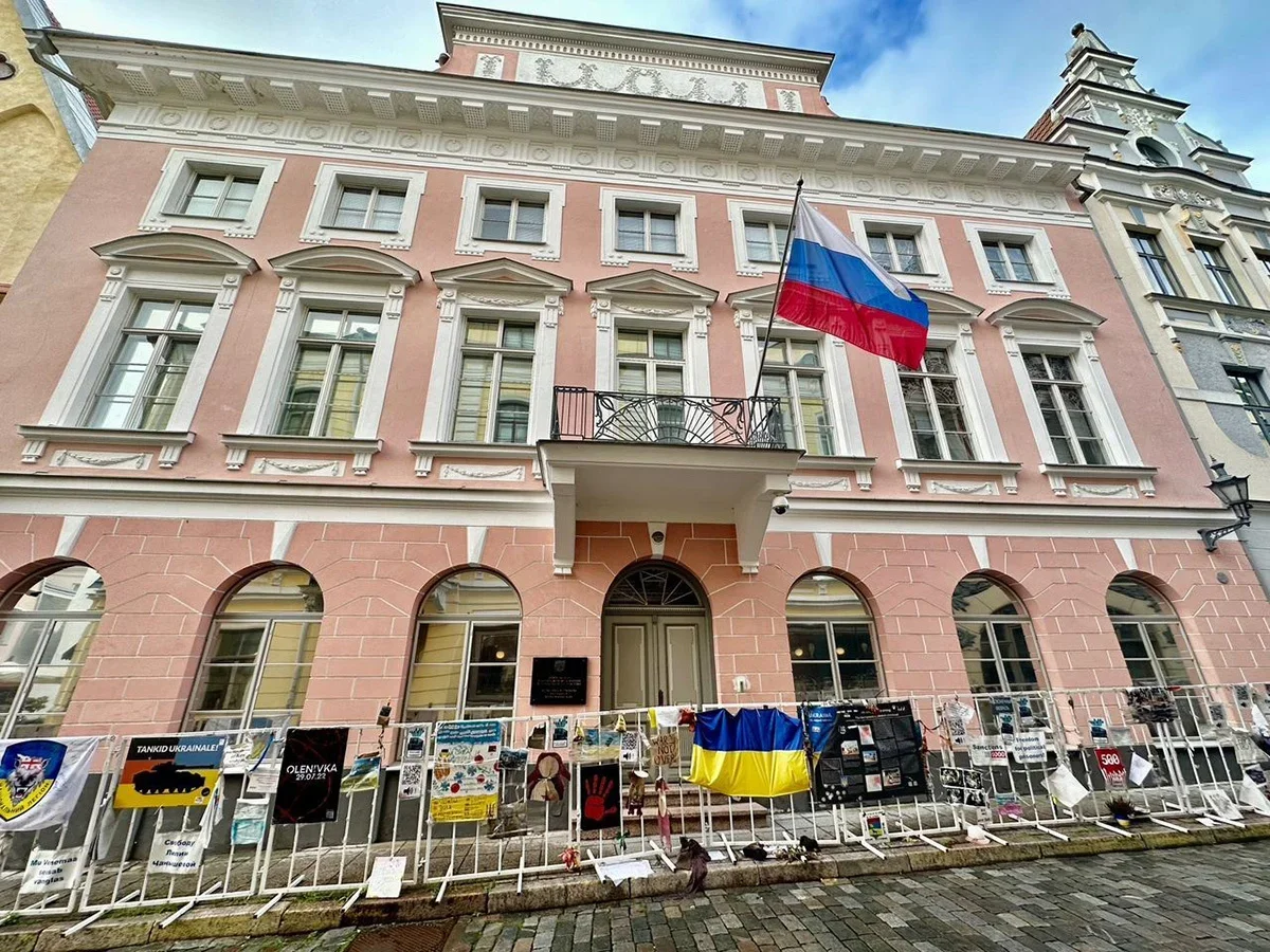The Russian Embassy in Tallinn, Estonia. Photo: Daniel Thüler“Russia!!!! Your dictator kills children!!!!” written on a poster in front of the entrance to the Russian embassy in Tallinn. Photo sent by Novaya Europe subscribers