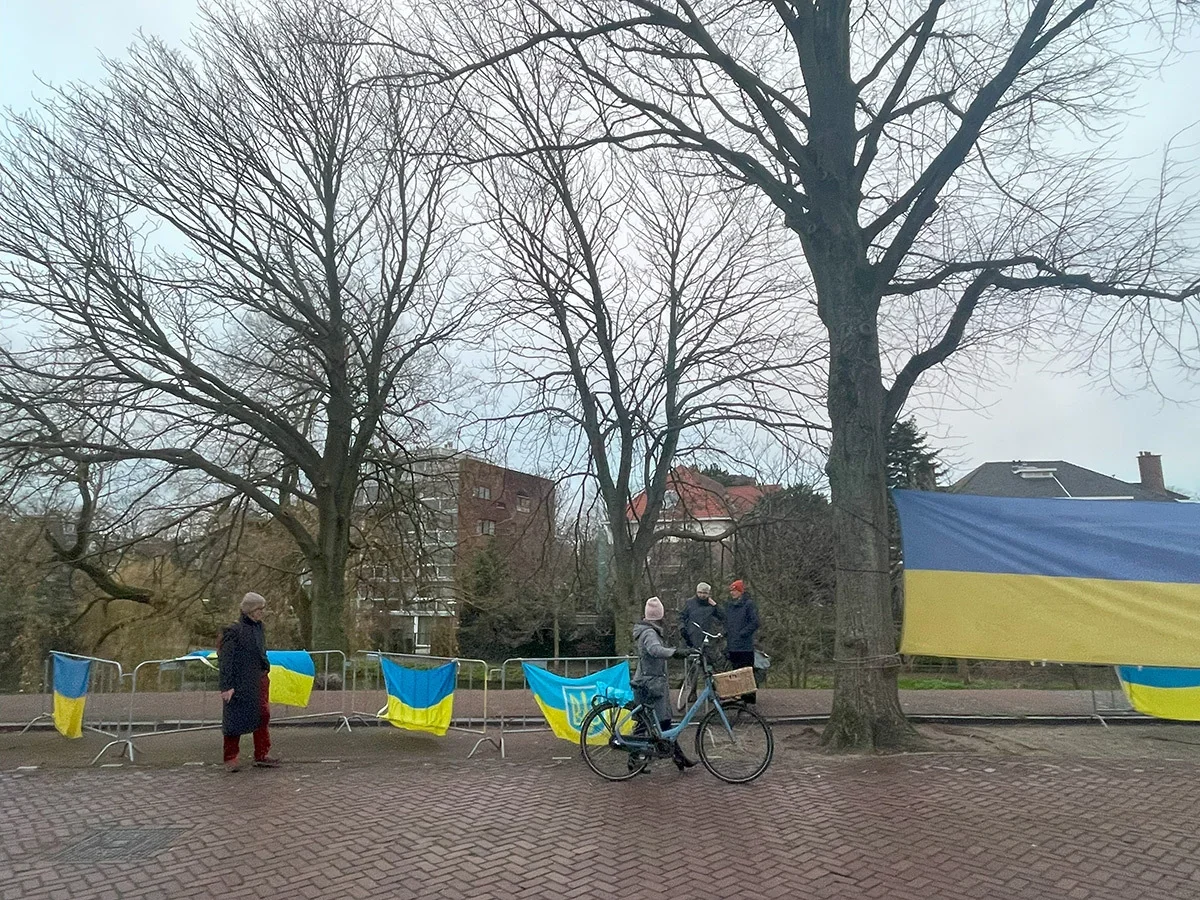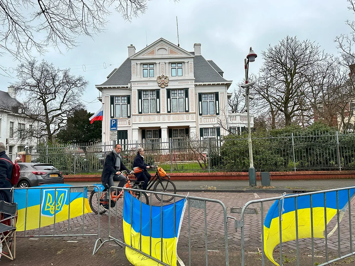 The Russian embassy building in The Hague, Netherlands. Photo: Ilya VolzhskyUkrainian flags opposite the Russian embassy in The Hague, Netherlands. Photo: Ilya Volzhsky
