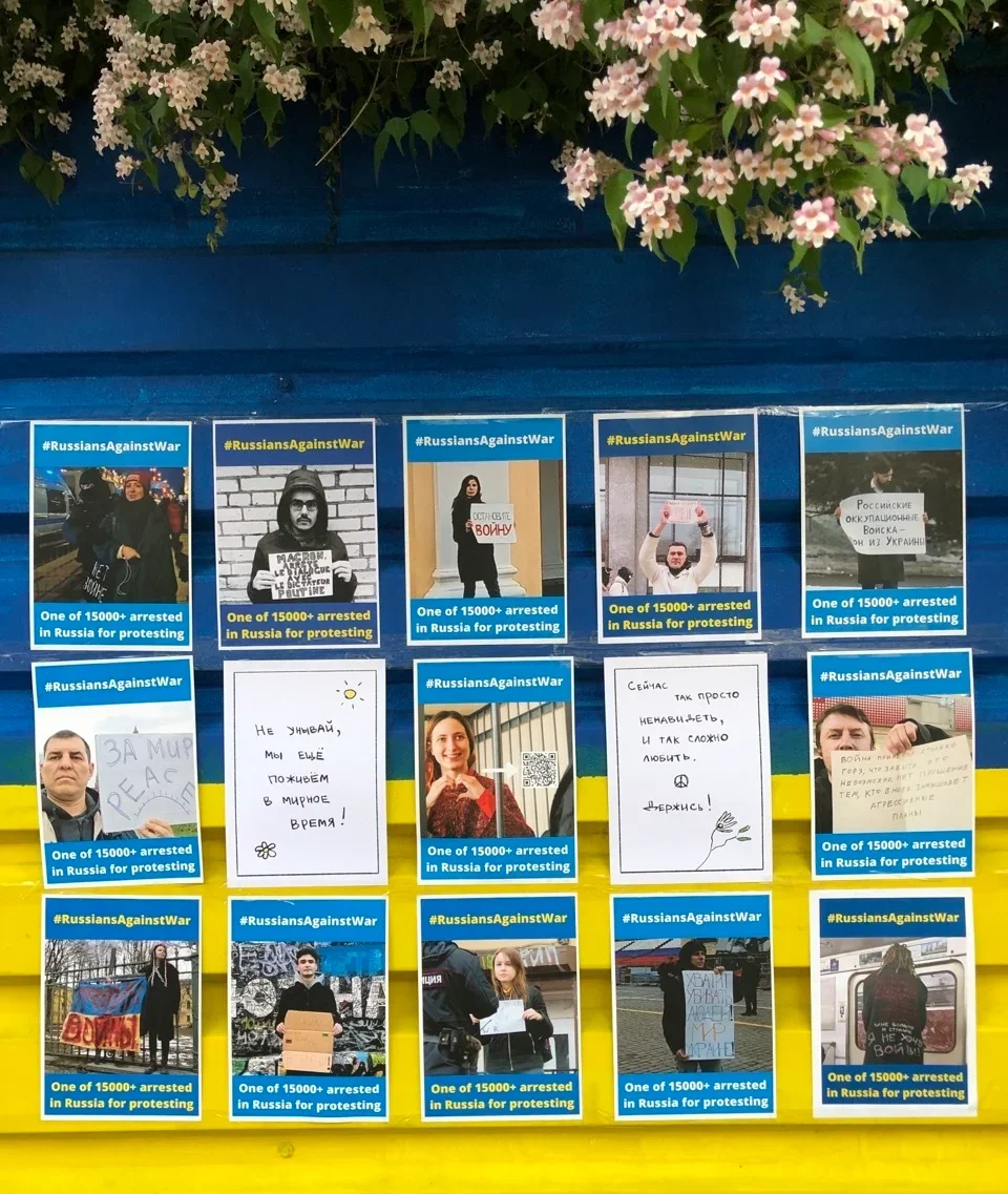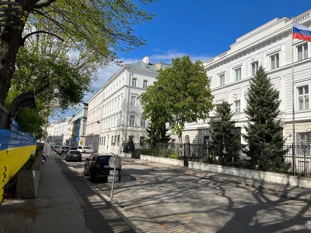 The fence outside the Russian embassy in Vienna, Austria, is painted in the colours of the Ukrainian flag. Photo: Pyotr Petrenko“Russians against the war” posters are displayed opposite the Russian embassy in Vienna, Austria. Photo: Pyotr Petrenko