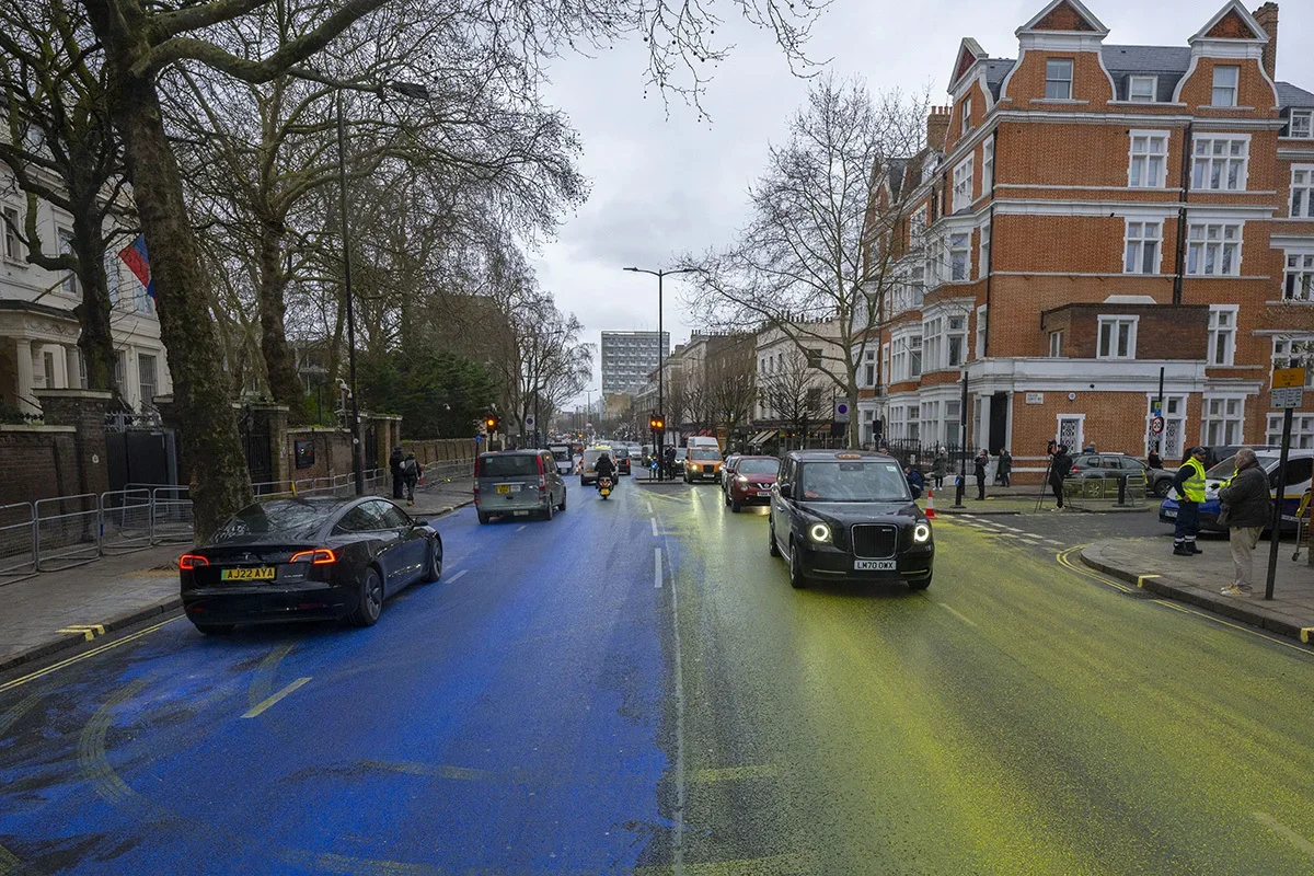The Ukrainian flag, painted by a group of activists on the street in front of the Russian embassy, London, 23 February 2023. Photo: Rasid Necati Aslim / Anadolu Agency / Getty ImagesAnti-war posters near the Russian embassy in London. Photo sent by Novaya Europe subscribers