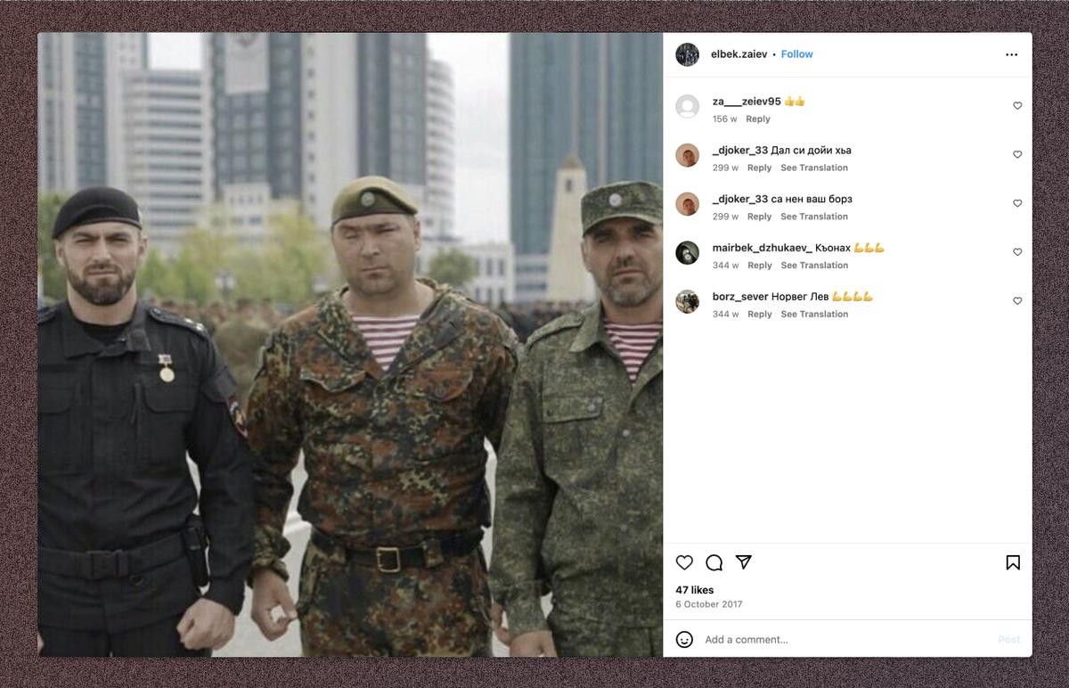 В 2017 году он опубликовал фото трех людей в форме. Двое из них — братья Делимхановы, Алибек и Шарип. Оба — генералы Росгвардии и родственники правой руки Рамзана Кадырова, Адама Делимханова. Третий человек на фото (по центру) менее известен.