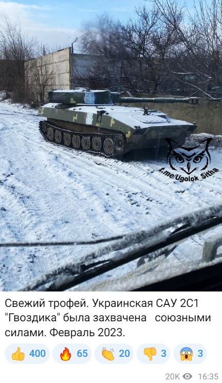 "Свежий трофей. Украинская САУ 2С1 "Гвоздика" была захвачена союзными силами. Февраль 2023", – говорится в посте, опубликованном в "Уголке Ситха" 3 февраля.