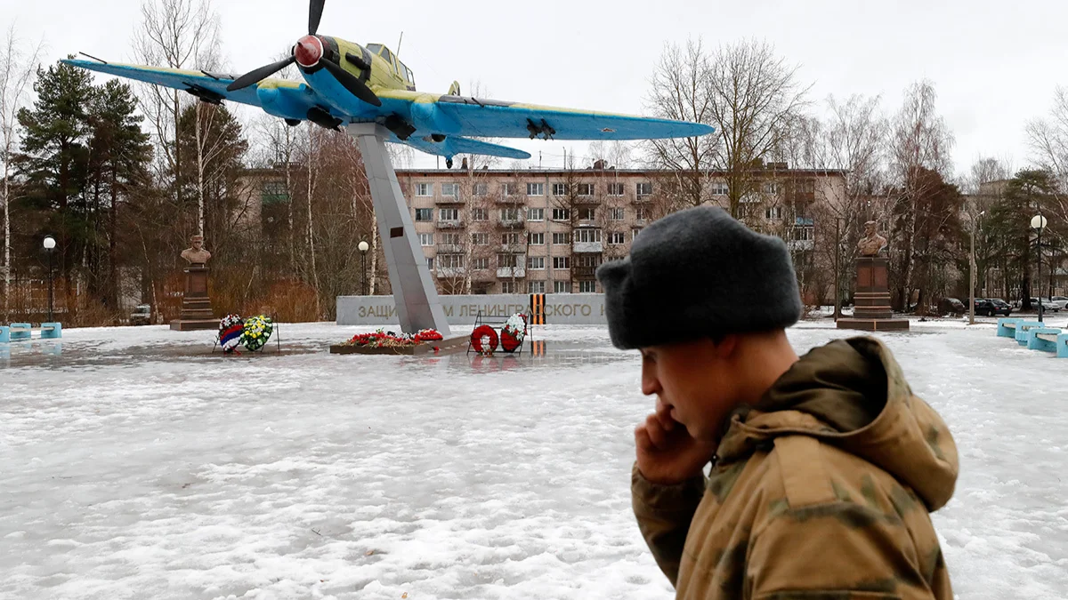 Российский солдат проходит мимо самолета-памятника Ил-2, посвященного защитникам ленинградского неба во время Второй мировой войны, в Лебяжьем, под Санкт-Петербургом, 15 марта 2023 года. Фото: Анатолий Мальцев / EPA