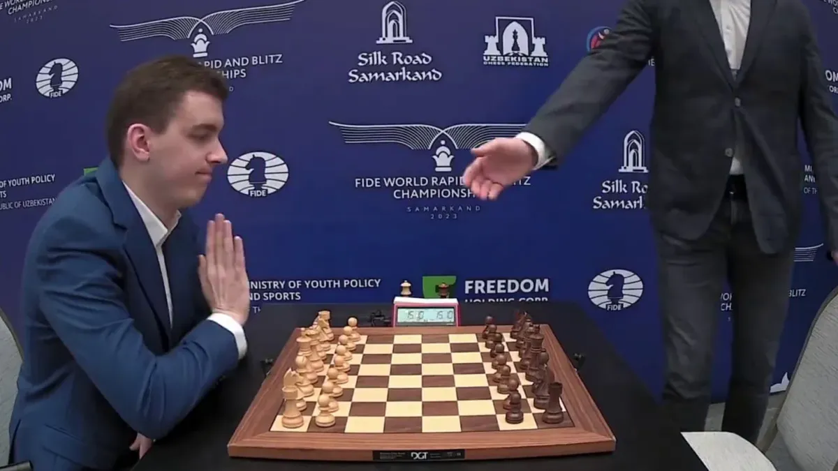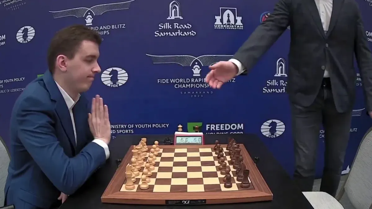 Poland’s number one GM Jan-Krzysztof Duda refuses to shake hands with Russian GM Denis Khismatullin. Screenshot from the video footage of the 2023 World Rapid Championship.